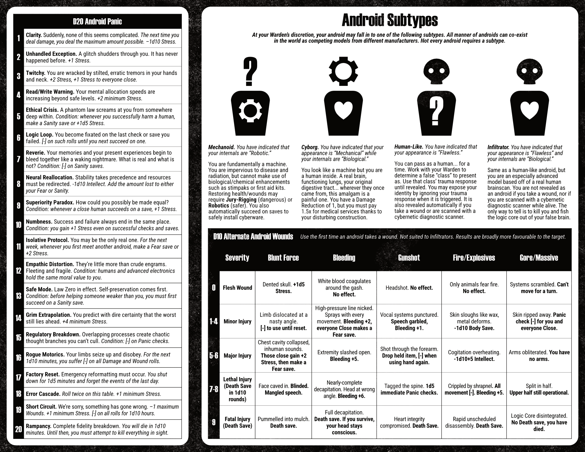 - Bespoke Android Panic and Wound tables to add some new twists to your next death spiral!